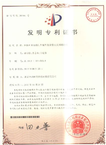 近日,我公司又一项发明专利“图像和多波段红外紫外复合型火灾探测方法”通过了国家知识产权局的审查,并荣获发明专利证书,专利号为ZL201210214560.8。此发明专利证书的获得, 是我公司在知识产权方面取得的又一成绩,充分展示了我公司高效的自主研发能力和持续的自主创新能力。